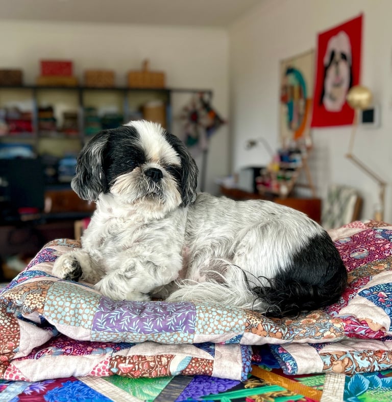 I am the Shih Tzu extraordinaire called Grizzly. Big in name, big in ego. I am always close by my human Sonja and like to oversee everything going on in the Quilting Studio. Apparently, I am quite the muse. I hope I can inspire you too! And don’t worry; I don’t shed or bark or jump up asking for attention. I am super laid back. Unfortunately, I am known to snore quite loudly at times.