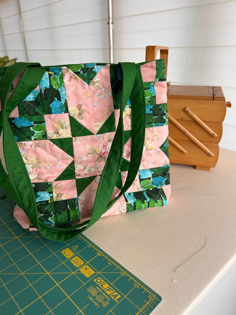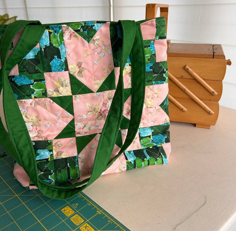 Once you have created your appliqué block and your curved seams block, you will be shown how to put it all together to create a handy tote bag.